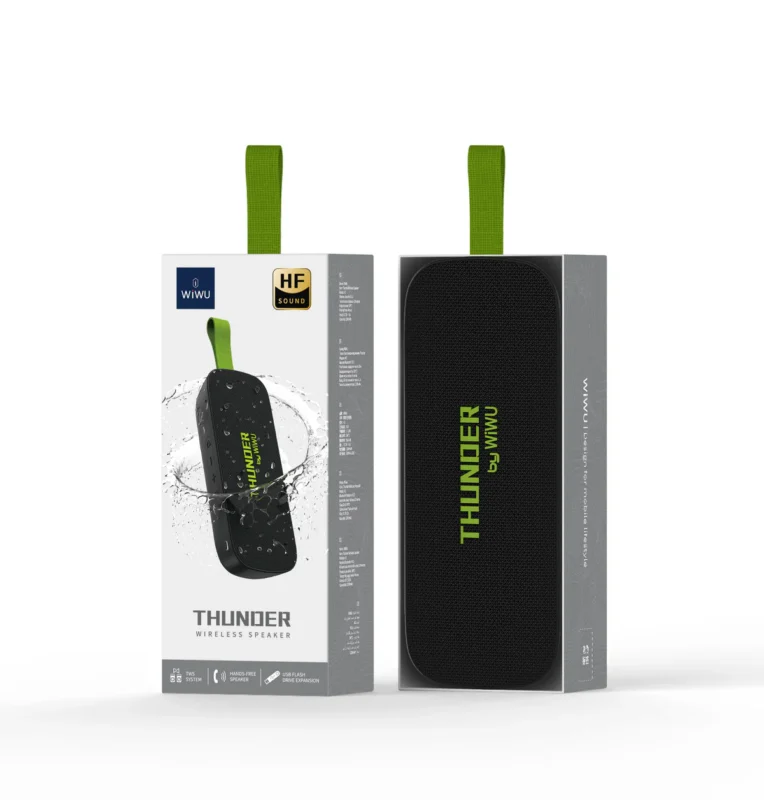 Enjoy versatility with Bluetooth, AUX, TF card, and USB drive support. Switch between modes effortlessly for continuous entertainment. Play your favorite tunes your way. The sleek, compact body makes it easy to carry anywhere. Its modern design blends elegance with durability. Take it along for outdoor trips, parties, or daily use. Answer calls with one touch using the integrated microphone. The clear voice pickup ensures smooth conversations. Stay connected without switching devices. The rugged build withstands daily use and outdoor conditions. WiWU Thunder Wireless Portable Speaker-H2 — water-resistant design protects against splashes and light rain. Enjoy music worry-free in any setting.